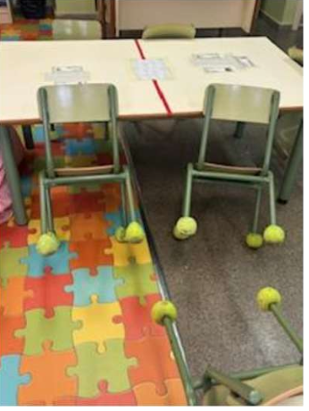 En algunas clases donde hay alumnos/as con hipersensibilidad sensorial se han colocado pelotas de tenis para minimizar el ruido de las sillas. Esta foto se ha hecho en la clase de cuatro años con la tutora Pilar.